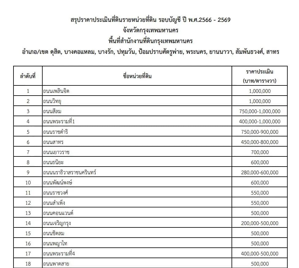 ภายในไฟล์ PDF จะแสดงรายการราคาประเมินแยกตาม ถนน/ทำเลหลักในแต่ละเขต พร้อมระบุช่วงราคาประเมิน ต่อตารางวา